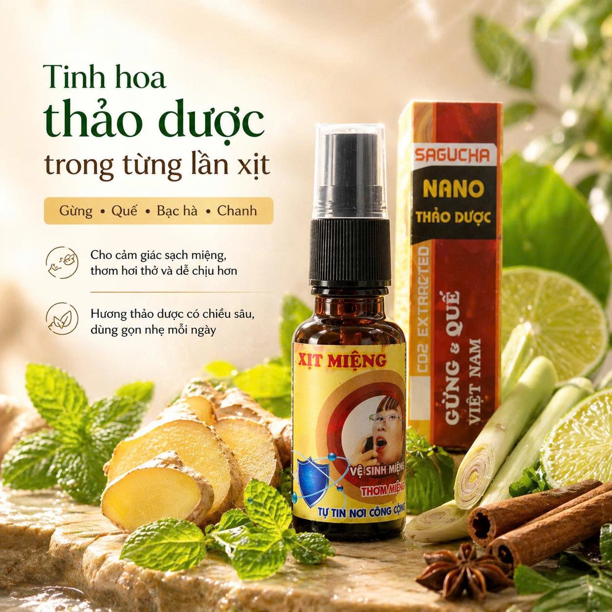 Nano thảo dược xịt miệng Gừng Quế Sagucha – Giải pháp tự nhiên cho vấn đề vệ sinh miệng, hôi miệng,hỗ trợ trong trường hợp ho, viêm họng