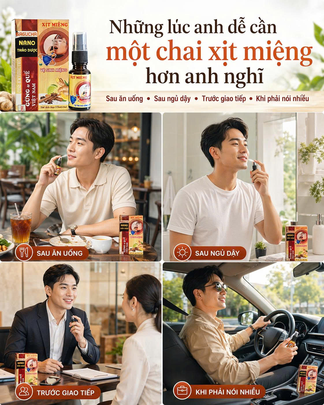 Trong trường hợp sau khi ăn uống nơi công cộng, tiếp xúc đông người trong vòng 1-2 giờ bạn nên dùng Nano thảo dược xịt miệng Sagucha xịt 1-2 nhác vào miệng, ngậm kỹ, đảo đều trong miệng, đến khắp những nơi cần thiết. Bạn có thể dùng xịt miệng thảo dược này hàng ngày: sáng, trưa, chiều và trước khi ngủ để tự tin hơn.